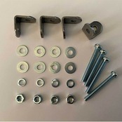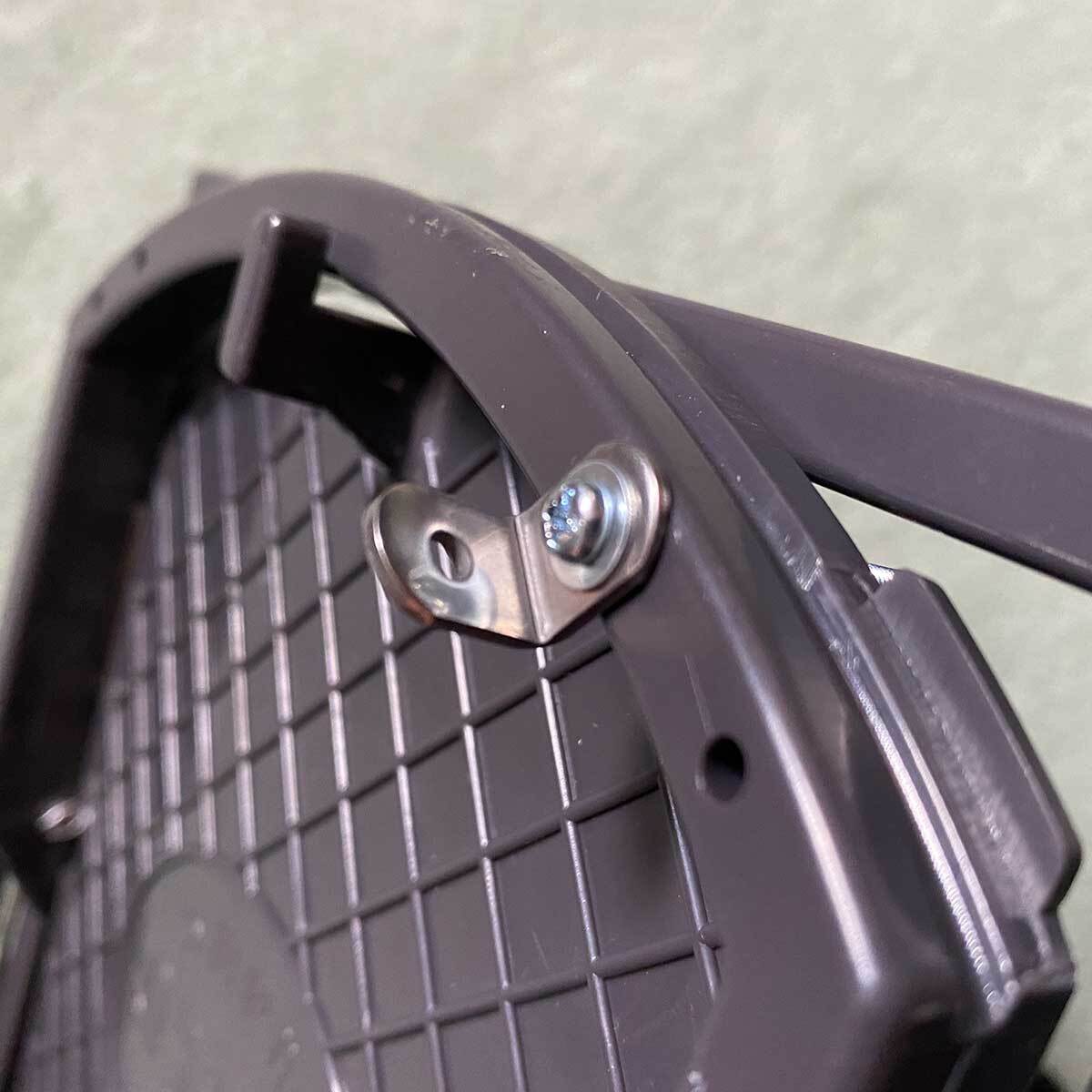板枠4隅にφ12cm用(内側)とφ15cm用(外側)の穴があります。ご自身の地域の規制に合わせて金具を右の順でセットし工具で固定します。やや自由度があるくらいに固定しておくとワイヤーがかけやすいです。